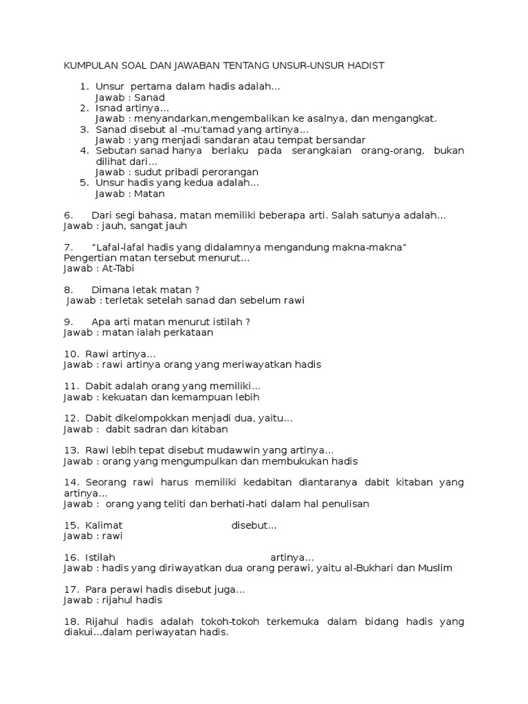 Kumpulan Soal Dan Jawaban Tentang Unsur Unsur Hadist