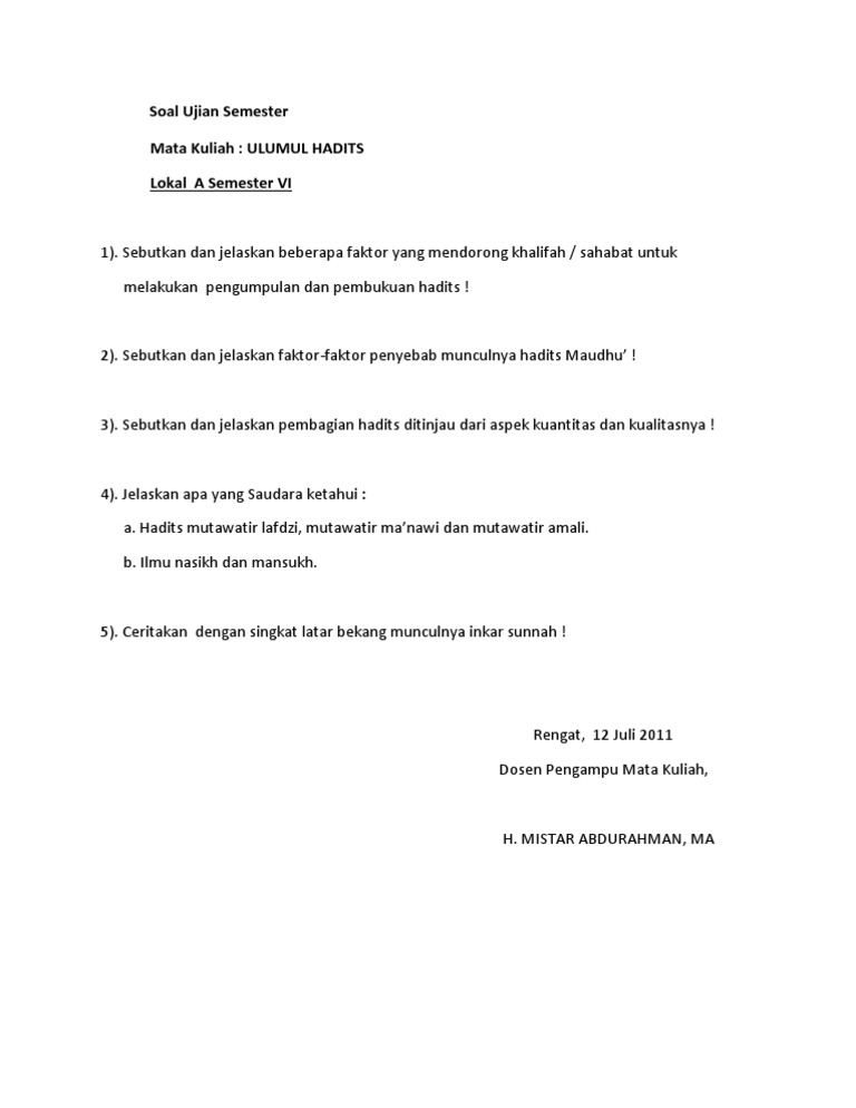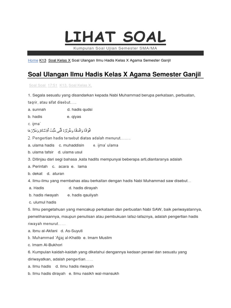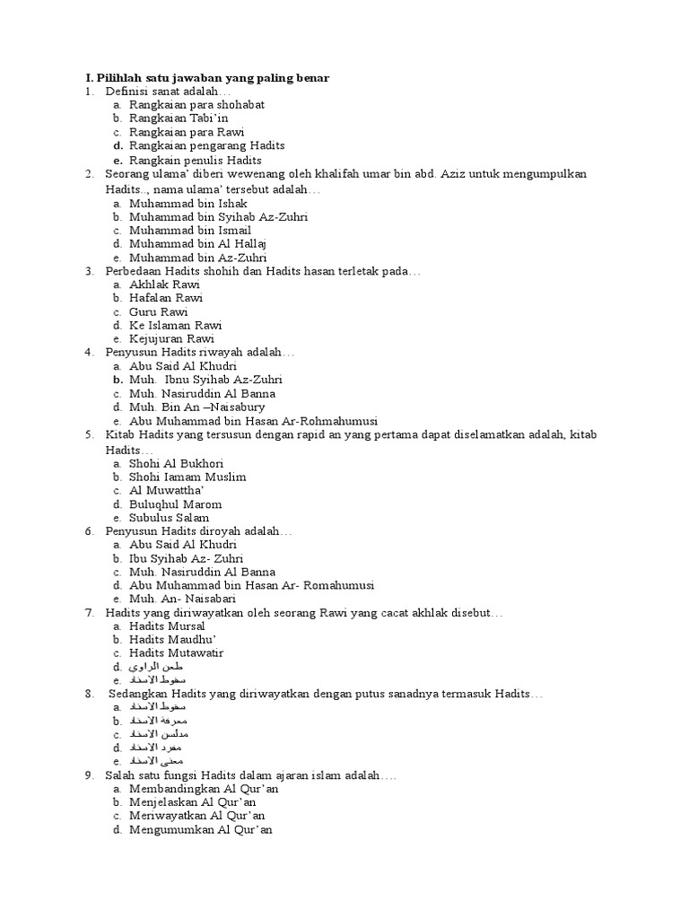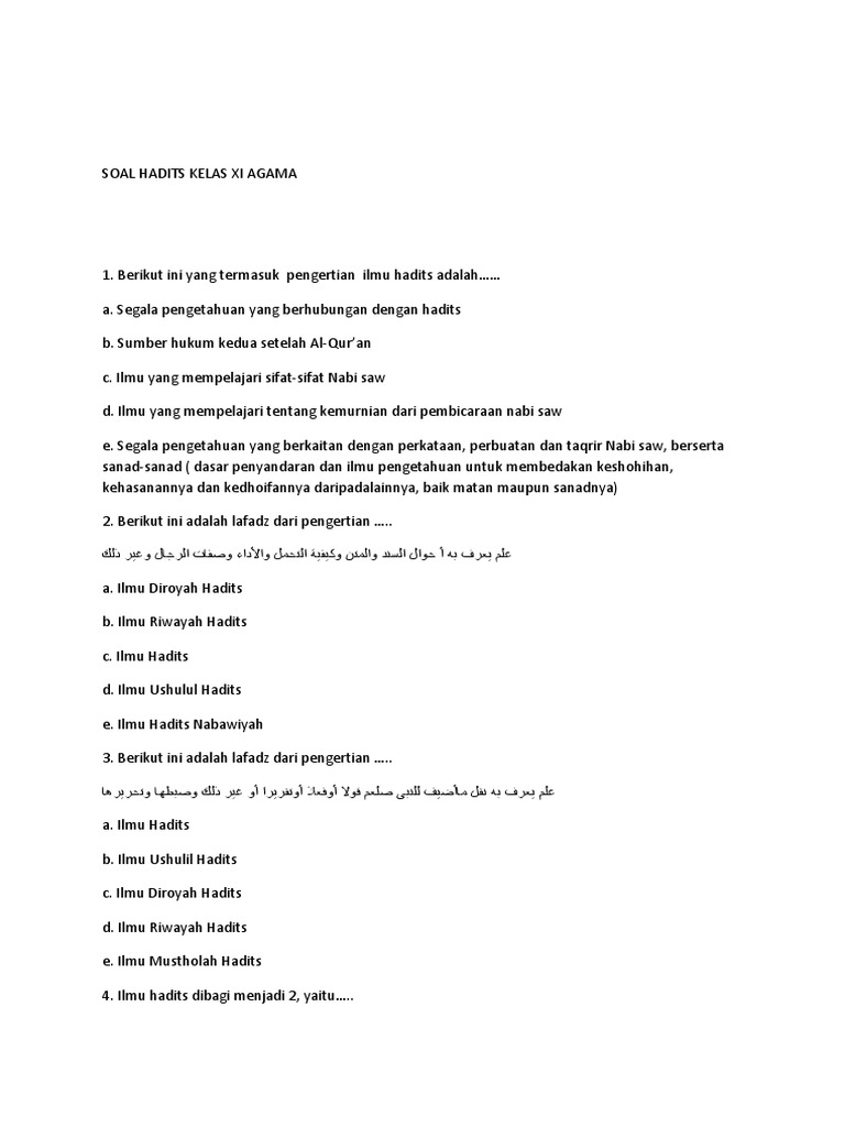 Kumpulan soal ilmu hadits. Dari Abdullah bin Amr sesunggunya. Sedangkan al-hadis di kalangan ulama hadis berarti segala sesuatu yang disandarkan kepada nabi Muhammad Saw. Latihan soal dan kunci jawaban uambn al qur an hadist mts tahun 2019 2020 yang bersumber dari naskah asli soal uambn al qur an hadist mts tahun 2018 2020 bertujuan untuk memantapkan persiapan para siswa mts dalam menghadapi pelaksanaan uambn tahun 2020.