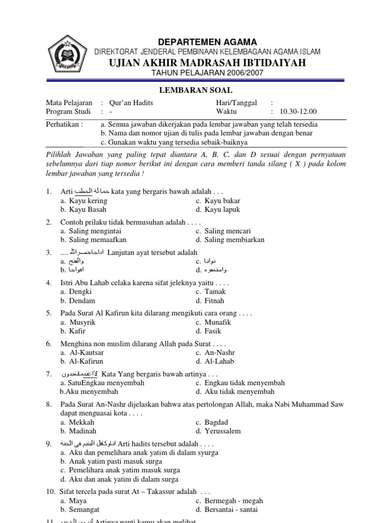 Guru sd smp sma contoh soal uambn al qur an hadits ma 2018. Soal uts al qur an hadits kelas 7 8 9 mts semester 1 ganjil contoh soal uts kelas 2 tema 2 bermain di lingkunganku semester 1 kurikulum 2013. Soal pts al qur an hadist kelas 5 mi semester 2 kurikulum 2013 ini dapat saya katakana juga sebagai prediksi soal uts al qur an hadist kelas 5 mi semester 2.