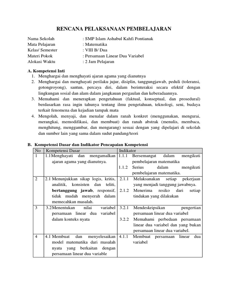 Rpp Kurikulum 2013 Persamaan Linear Dua Variabel